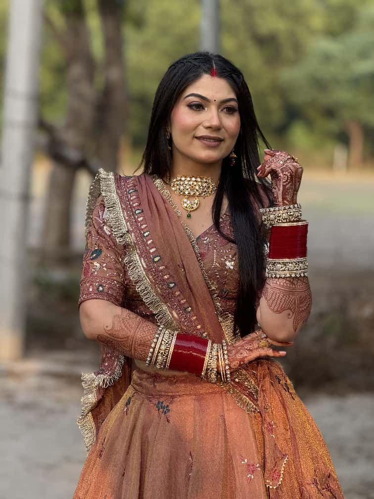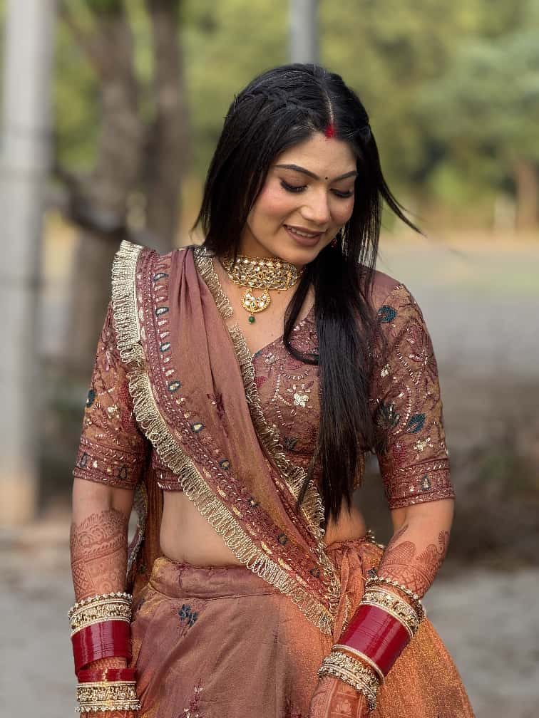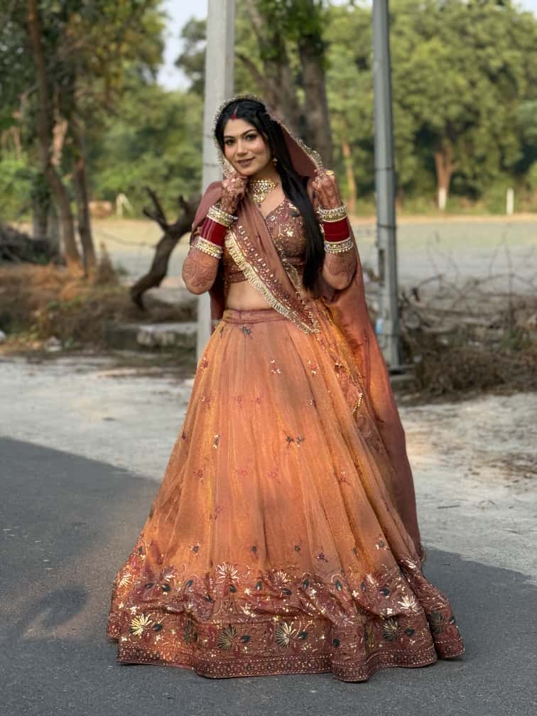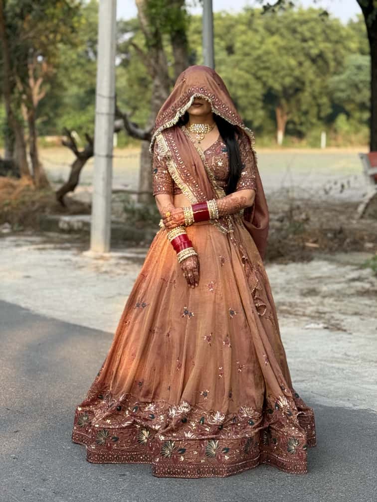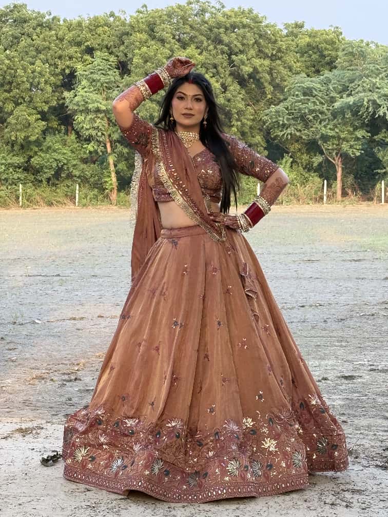 Step into timeless elegance with this gorgeous peach-brown embroidered lehenga from Radhika Boutique. Crafted with intricate thread and sequin work, this lehenga features a rich full flare and a beautifully coordinated dupatta, giving you a royal and graceful look.