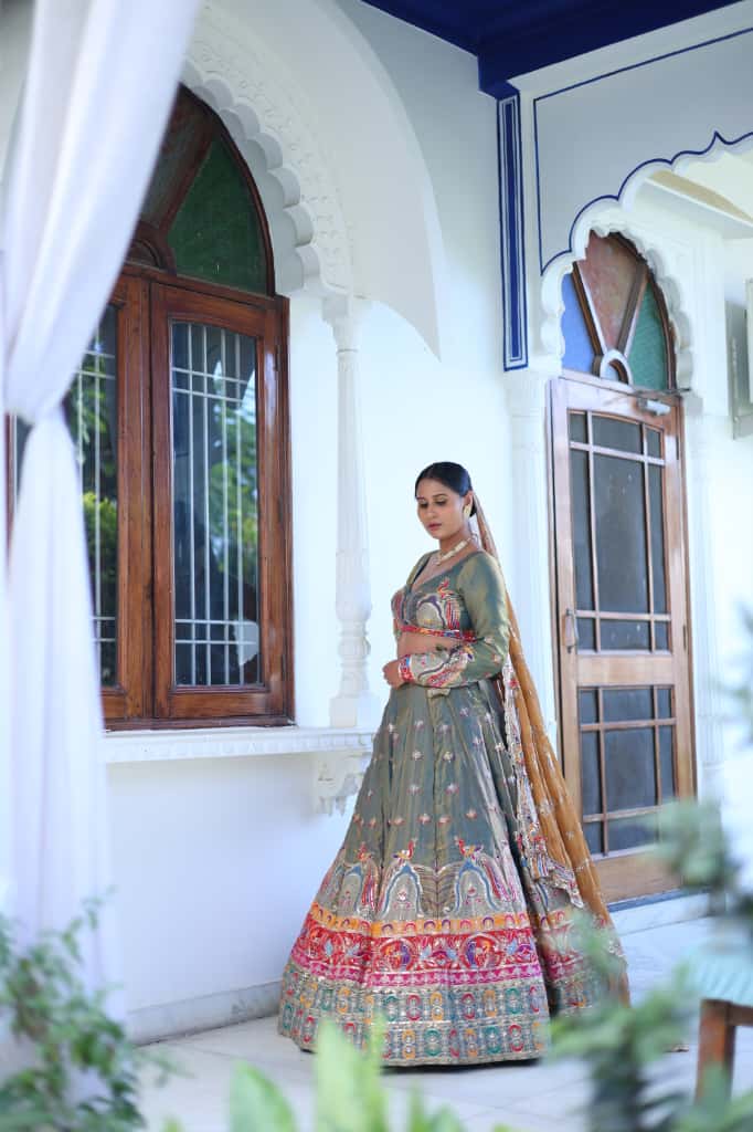 Add a royal and festive charm to your special day with this green multicolor embroidered bridal lehenga from Radhika Boutique. Crafted with rich detailing and premium stitching, this lehenga blends bright colors with traditional craftsmanship.