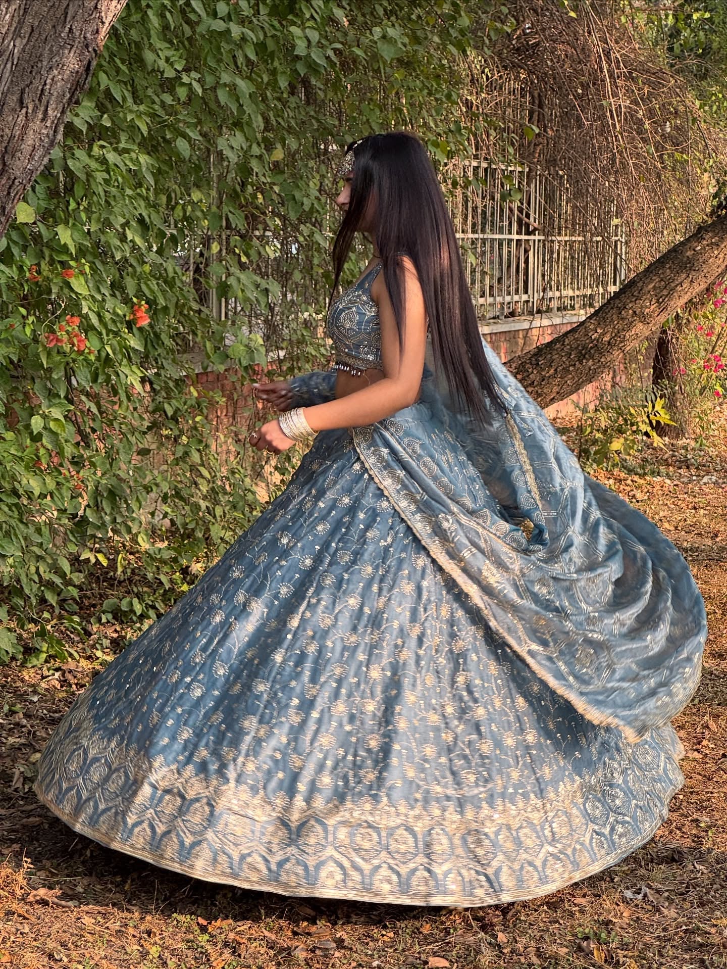Elevate your festive and wedding wardrobe with this premium silk blend lehenga set, designed to reflect timeless elegance and traditional craftsmanship. The lehenga skirt is crafted from a luxurious silk blend fabric and adorned with intricate all-over silver zari and fine thread embroidery, creating a rich and graceful look with a beautiful, flowing fall.